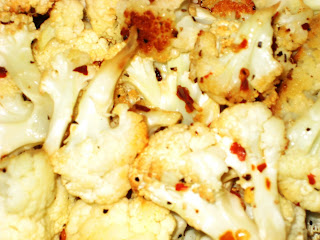 Spray the cauliflower with PAM and mix it with salt, pepper, and red pepper flakes to taste. Roast it in a 400 degree oven for 30 minutes, stirring once midway through.
