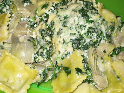 3) Cook the ravioli according to package directions. Mix the ricotta, spinach and artichoke hearts together. Season with salt and pepper.