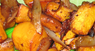 I first discovered winter squash about a year ago when I randomly decided that I was going to try a new veggie every week. I got through butternut squash, kale, and turnips before I threw in the towel…more because I had to run from store to store trying to find the produce in question than because of any lack of enthusiasm on my part. This little introduction, however, was all I needed to realize that winter squash and I were meant for each other. Since that fateful first recipe of butternut squash mashed with thyme and parmesan cheese, I have gone on to include this root vegetable, along with its sisters, the acorn and buttercup varieties, in as many of my meals as possible. The recipe that I’ve made tonight, roasted butternut squash with shallots, combines the sweetness of the squash and brown sugar with the tartness of balsamic vinegar in a way that really pleases the palate. Balsamic and brown sugar are one of my favorite flavor combos and so this hit the spot after the achiness that set in after my baby-sitting gig today (who knew that holding an 8 lb 1 month old for 2 hours could be so tiring).