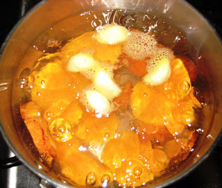2. Slice the sweet potatoes. Boil with garlic for five minutes. Mash the garlic with a fork and set aside.