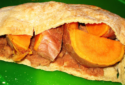 Heat up a 1/2 lb sweet potato in the microwave for 2 1/2 minutes, making sure to prick it all over first. Turn it over and microwave for another 2 minutes. Spread the refried beans in the pita. Microwave until warm (about 40 seconds). Cut the sweet potato in half and put half in the pita. Save the other half for tomorrow’s pita. Rejoice at how filling and delicious this is.