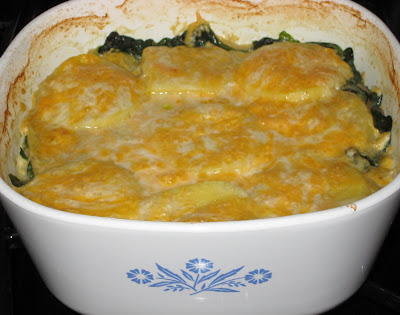 Preheat the oven to 350. Heat the olive oil in a non-stick skillet and saute the mushrooms over high heat, until slightly browned (about six minutes). Add the shallot and cook on low heat for 3 minutes. Add in the spinach until all of it is wilted (I had to add it a handful at a time because my pan was getting full). Season with salt and pepper. Spread into a casserole dish.