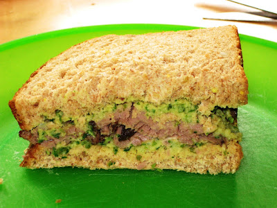 Anyways, earlier in the week, I had some (okay, a whole bunch) of cilantro left in the fridge that I forgot to have with my sweet potato enchiladas. Taking some inspiration from Sophia over at Burp and Slurp, I thought I would do the intelligent thing and turn it into a spread. It is no coincidence that my favorite Trader Joe’s hummus is the cilantro-jalapeno one, so I set about recreating it. Thus hummus was so yummy and made a TON, probably about 1 1/2 cups. Plus, since I already had tahini on hand, I’m sure it was much more cost-effective than buying it in the store. I never realized how easy making hummus would be, and I can’t wait to try out some new varieties. The hummus itself is vegan, although I enjoyed it on a sandwich with roast beef, which is decidedly NOT vegan. I couldn’t help it. I saw an episode of the Barefoot Contessa the other day in which she was making roast beef sandwiches, and was hypnotized.