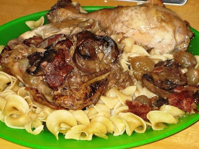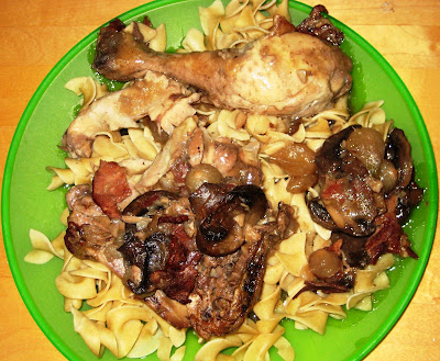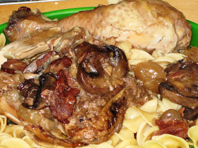 A bit light on the alcohol for a “real” coq au vin, but a tasty dish none the less. Good luck