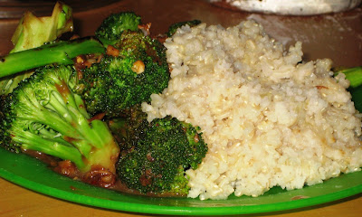 Now for the good part. The thing that I hate about brown rice is that it takes FOREVER to cook, which is annoying when you live in a dorm and can’t just set it up on the stove and leave it to simmer for 50 minutes while you run around doing a bazillion other things. My solution to this was to CROCKPOT it. I added 3/4 cup rice, 2 cups water, and some salt to the crockpot. Put it on low and left for the gym. When I came back (about an hour/hour and fifteen minutes later) there was still a lot of water. And I was hungry. So I put it on high, went down to cook, and came back to mostly done brown rice. It was sticky in the way of Chinese food rice (maybe I added too much water) and all around pretty good. If I had to do it again, I would probably do it on high for the whole time, but I was afraid it would dry out too much.