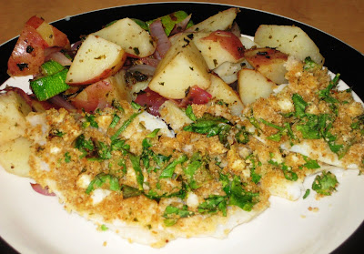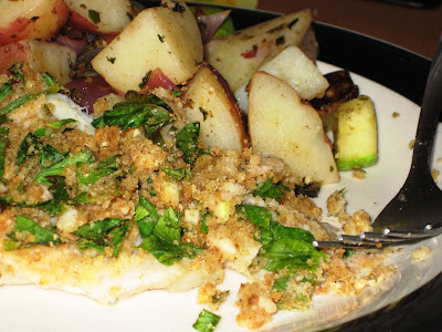 1. Preheat the oven to 450. Coat a baking sheet with cooking spray. Place the fish fillets on the baking sheet. Combine the olive oil, bread crumbs, parsley, lemon juice, garlic, salt, and oregano in a small bowl. Press the bread crumb mixture onto the tops of the fillets. Bake for 10 minutes.As for the potatoes. I had some pesto frozen in an ice cube tray in the fridge made from fresh and aromatic Farmer’s Market basil and walnuts (minus the parmesan cheese because it apparently doesn’t freeze well). I also had a zucchini that was on its last legs. And some red onion. So I thought I would roast the zucchini and red onion to get a nice caramelized taste, boil the potatoes, and toss it all with a cube of the pesto. And thus you have a 30 minute meal, Joanne-style.