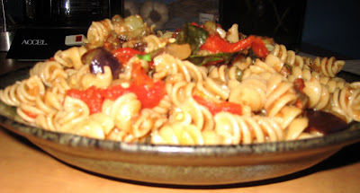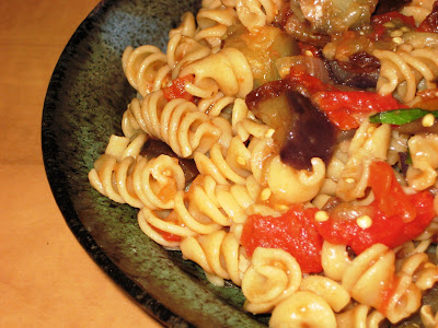 When I first got the Bon Appetit Fast/Easy/Fresh cookbook and was paging through it, this recipe caught my eye. Mainly because of the word “eggplant” in the title. I love eggplant and only recently discovered that there are so many people who are allergic to it! Apparently it makes their tongues feel fuzzy. Kiwi has that effect on me. Weird. Anyway, I made the recipe basically as is, although I scaled down the pine nuts and capers as well as switched out the currants for raisins. I couldn’t find dried currants in the store and from what I could tell they aren’t that dissimilar from raisins. The saltiness of the capers was balanced really well by the sweetness of the raisins. The dish contained so many different flavors that each bite seemed like I was tasting the dish for the first time. Definitely a keeper recipe.Fusilli with Eggplant, Pine Nuts, Capers, and Raisins