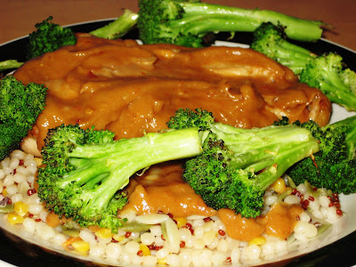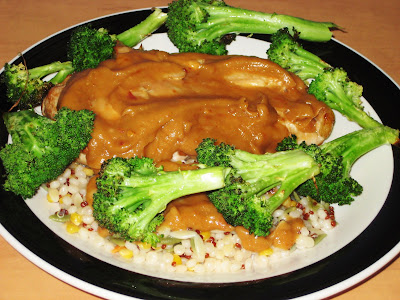 3. Plate the broccoli, chicken, and couscous, and then pour the peanut sauce over it.