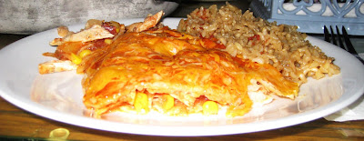 Second, a corollary.  I have gone out every night since Friday and am definitely paying for it in terms of sleep.  I start my first day of lab today and so perhaps tonight will actually be a restful one.  If I start to sputter or speak in completely illogical sentences, let me know.Third, I made these chicken enchiladas for the family before I left for school.  I am sorry they are not photogenic.  I am also sorry that they are not really enchiladas.  I got lazy and made them into a casserole.  My dad loved them, extolling their virtues to my brother, who was doubtful.  I thought they could have been a little spicier and more seasoned but that’s probably because I toned down the spices and seasoning for my aforementioned father.  It’s also probably because I could douse all my food in red pepper flakes and still beg for more.  I made these with a recipe that I found for Spanish Rice on Simply Recipes, which was a definite hit for the family.