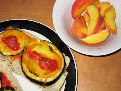 And really, at this point in the summer, when eggplants and tomatoes abound, what makes more sense than an eggplant parmesan sandwich? Especially when the eggplant is grilled (or broiled in my case), layered onto some good rosemary focaccia or ciabatta with slices of tomato, sprinkled with a dusting of parmesan cheese, and then popped under the broiler again so that the cheese gets melty and the bread gets crispy? There is very little that could have satisfied me more.