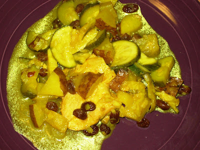 The dish does look very tasty. That’s too bad about the raisins, though. One of the reasons I like raisins in my curries or other Indian foods is because of the nice raisiny-sweet-spicy flavour.