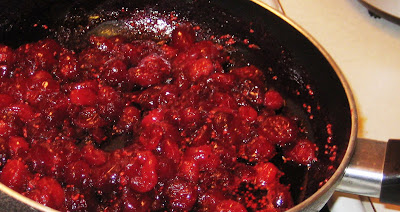 Combine all of the ingredients on the stove over medium heat and cook until the cranberries are just beginning to break down.  Allow to cool to room temperature and then refrigerate before serving so the pectin in the cranberries has a chance to gelatinize (what a great word!).