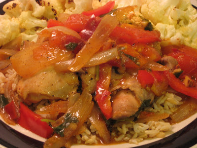 Heat the butter in a large heavy-bottomed pot over medium-low heat. Add the onions, ginger, and garlic and cook slowly until the onions are very soft, about 15 minutes. Add the tomato paste, curry powder, cinnamon stick, and chiles and give it a good stir; season with salt and pepper. Pour in the coconut milk and chicken stock and bring it back to a simmer; cook until the sauce has thickened, about 20 minutes, adding in the chopped red pepper about halfway through. Add the tomatoes, chicken, cilantro, and half the lemon juice; continue to simmer until the chicken is cooked through, about 10 to 15 minutes. Taste and adjust the seasoning with lemon juice, salt and pepper. Serve over the cauliflower and brown rice.