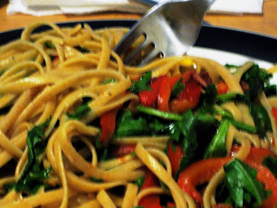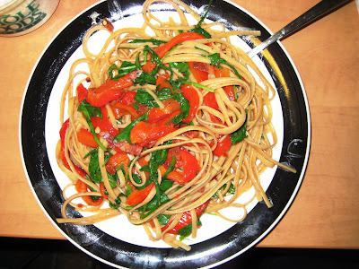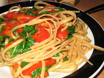 I first saw this recipe on Sidewalk Shoes, who found it on the Cooking Light website. There was no doubt in my mind that I would like it (I actually have never encountered a pasta that I didn’t like) but as Sophie said when she walked into the kitchen as I was cooking, “Bacon makes everything better.” Linguine with Arugula, Roasted Peppers, and Bacon