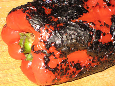 1. Roast the peppers over a gas flame or under a broiler. Having done the broiler method before, I decided to try using the gas flame. Call me a pyromaniac, but this way was infinitely more fun. Place the roasted red peppers in a closed container for 10 minutes, peel off the skin, de-seed, de-stem, and cut into slices.
