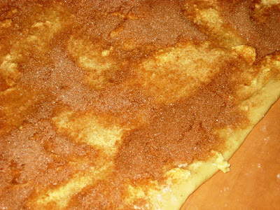 Turn dough onto a lightly floured board and roll out to make a 20×20 to 24×24 inch square. Spread with a thin layer of softened butter right to the edge. Mix 1/2 cup sugar with the cinnamon and sprinkle over the butter. Sprinkle the almonds over the cinnamon sugar. Roll up as for a jelly roll. (Beginning with the bottom edge closest to you, gently roll the dough away from you, pinching the ends together to prevent cinnamon sugar from spilling out.)