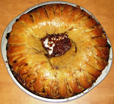 Preheat oven to 375 degrees F. Bake for 15 to 20 minutes or until just golden. (I baked mine for 15 minutes, then rotated it in the oven and baked it for another 5 minutes). While the ring bakes, mix the glaze ingredients. Brush the ring while hot with the glaze.