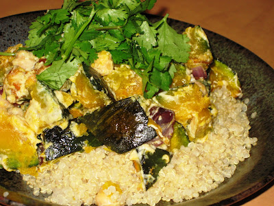 2. While the squash is roasting, whisk together the ingredients for the dressing and cook your grain of choice.  When the squash mix is done, toss it with the chickpeas and dressing.  Plate it on top of the cooked quinoa and then garnish with cilantro.