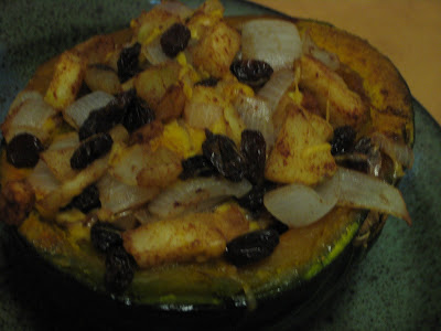 A quick inventory of my fridge and pantry followed by a quick visit to Recipezaar yielded this recipe for a winter squash stuffed with apples, raisins, and onions, which is then topped with a nice coating of cheddar cheese.  Exactly my kind of comfort food.Stuffed Kabocha with Raisins, Apples, and Cheddar