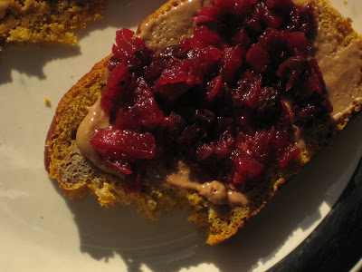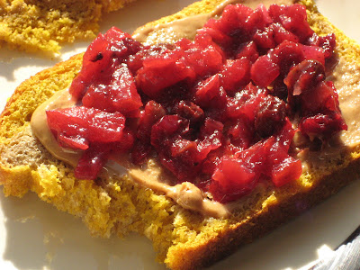 So I bring you this deconstructed peanut butter and “jelly” sandwich. Cranberry chutney instead of your traditional grape or raspberry jelly. Whole wheat pumpkin pie brioche because cranberries signify Thanksgiving and you can’t have Thanksgiving without pumpkin pie. (Pumpkin pie brioche thus becomes pumpkin pie deconstructed.) And peanut butter because, well, old habits die hard. All assembled into a somewhat cohesive whole and then eaten open-faced. Piece by piece. Because that is actually how I have always eaten sandwiches. Sometimes the whole is not better than the sum of its parts. Or in a more positive light, sometimes you just want to stop and smell the roses. And appreciate everything for what it is and not what it could be if you just tweaked it or changed it or molded it in some way.