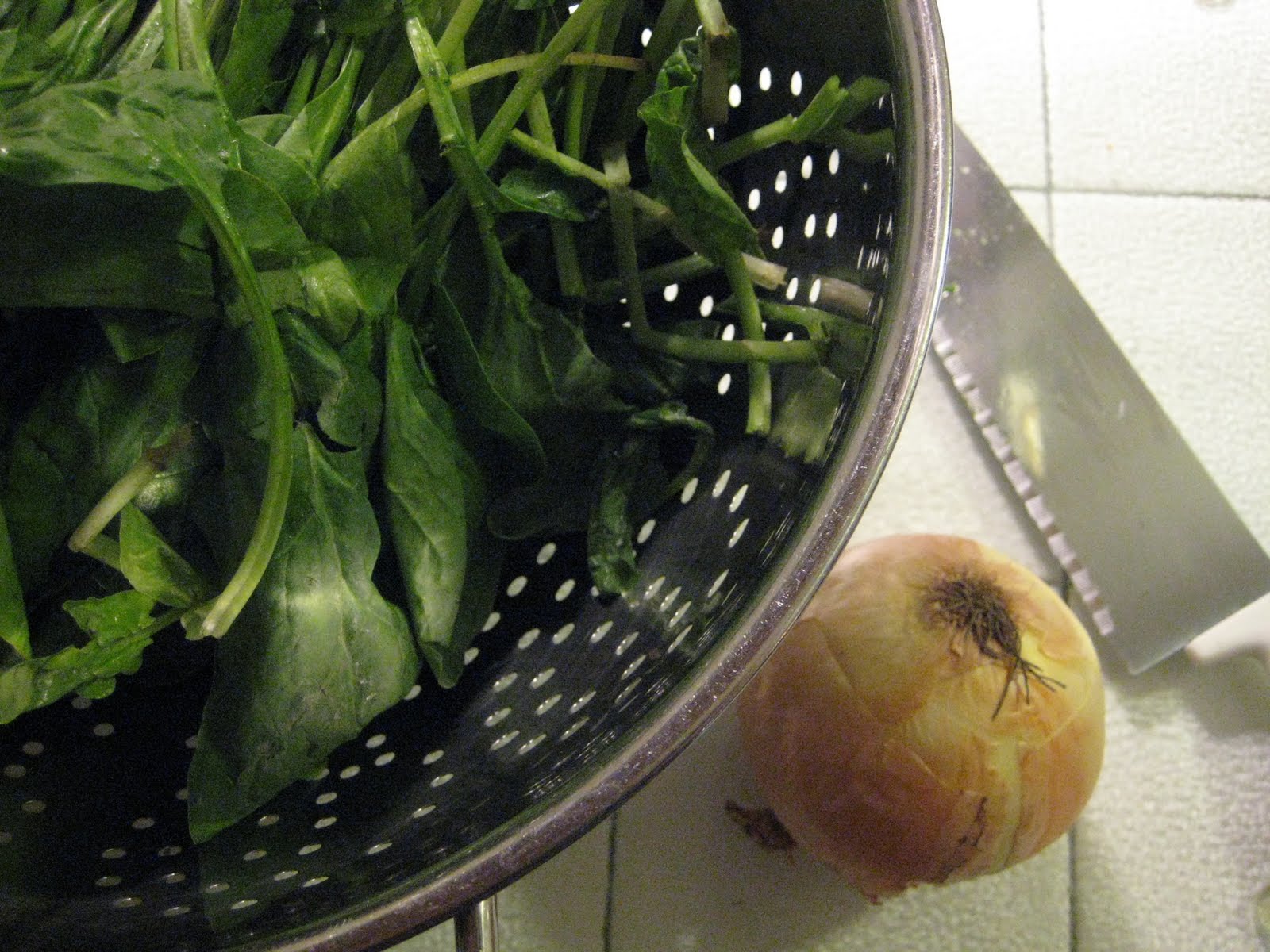 1. Heat 1 tbsp of olive oil. Add the onion and saute for 4 minutes. Add the spinach, reduce heat to low, cover and cook for 4 minutes. Using a slotted spoon, transfer the spinach to a bowl. Leave as many of the onions as you can.
