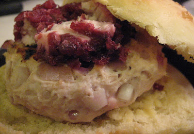 Now a fabulous burger bun like this calls for a fabulous burger. Back before Thanksgiving I had bought a log of cranberry goat cheese from Trader Joe’s. And I needed something to do with it. I thought about incorporating it into a pasta dish, or just making some grilled cheese. But then I thought, what goes better with cranberries than turkey? And what would be better on a burger bun than, well, a burger?