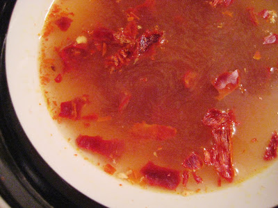 1. Deseed and destem the dried pepper. Chop it into small pieces and put them in a bowl. Soak in 1/2 cup hot veggie broth for half an hour.