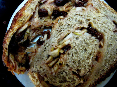So they got some yeast. Spent five minutes (a day) mixing up all the ingredients for the dough. Let it rise for two hours. Picked the apple. Chopped it up. Mixed it with some raisins and sugar and cinnamon (left out the walnuts). Rolled out the dough. Spread the filling on top. Shaped the loaf. Let it rise for 40 minutes. Preheated the oven to 350. Then baked for 50 minutes.