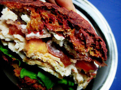Grilled Turkey, Bacon, Arugula, and Blue Cheese Sandwich on Red Beet Buns