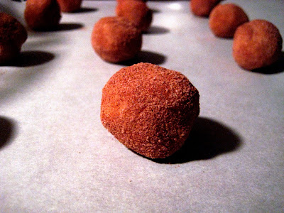 3. Once dough has chilled, in a small bowl, combine remaining 1/4 cup sugar and the ground cinnamon. Use a small ice-cream scoop (NOTE – I don’t own an ice cream scoop. Who needs such a thing when you have a spoon? So I just used rounded tbsps.) to form balls of the dough, and roll in cinnamon sugar. Place about two inches apart on the prepared baking sheets. Bake until the cookies are set in center and begin to crack (they will not brown), about 10 minutes, rotating the baking sheets after five minutes. Transfer the sheets to a wire rack to cool about five minutes before transferring the cookies to the rack.