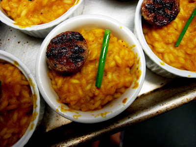 I heated some olive oil in a saute pan over medium heat and sauteed a box of arborio rice for about 2 minutes. In the meanwhile, I set a box and a half of chicken broth (about 6 cups) to simmer on the stove. Little by little, I added the chicken broth to the arborio rice, constantly stirring, only adding more when the last bit had just evaporated. When the rice was tender, I mixed in a can of pumpkin along with the roasted garlic, about 3 tbsp of mascarpone, and salt, nutmeg, and cinnamon to taste. I spooned this into ramekins, which I then placed in a 250 degree oven to keep warm.