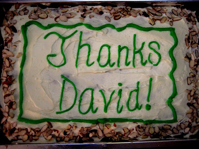 So. What goes into a cake for 25 people? Funny you should ask. 18×14 inches worth of batter. 6 cups of grated carrots. 4 cups of sugar. 2 batches of Dorie Greenspan’s carrot cake recipe. An hour and a half in the oven. And a whole lot of sweat and tears.