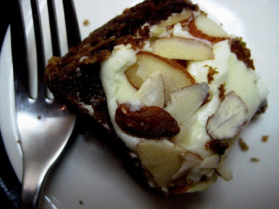 Your cake looks really moist and I like the almond slices over the frosting.