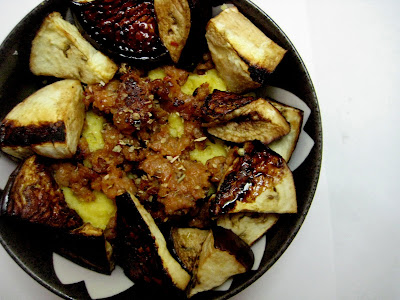 Preheat the oven to 400. Cut the eggplant into chunks. Sprinkle with balsamic vinegar and salt. Roast for 20 minutes or until soft.