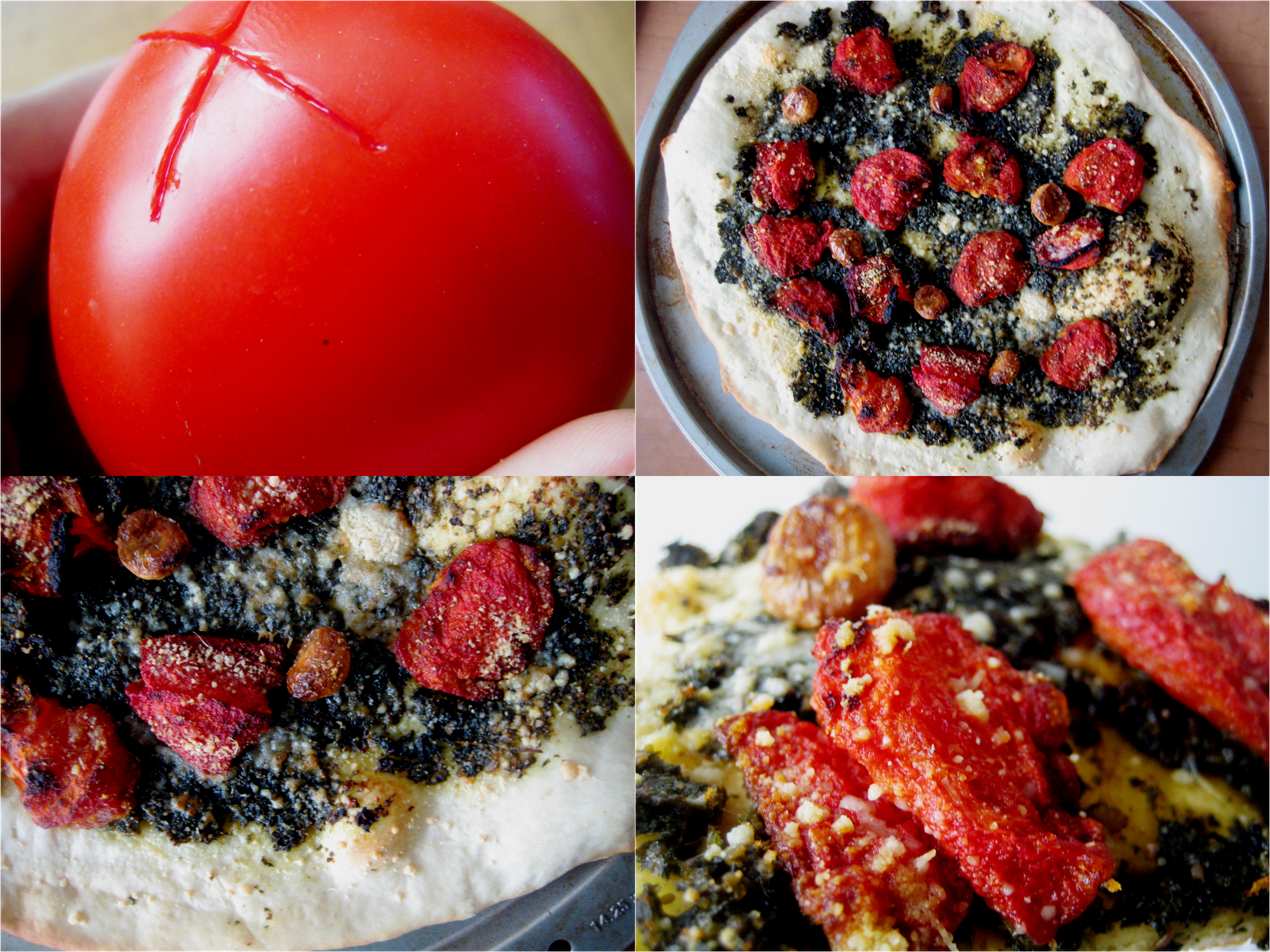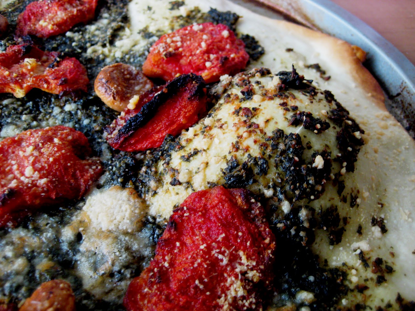 I love pizza, I love basil pesto and I love baked tomatoes. I wish I had a bite.
