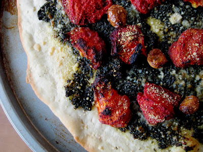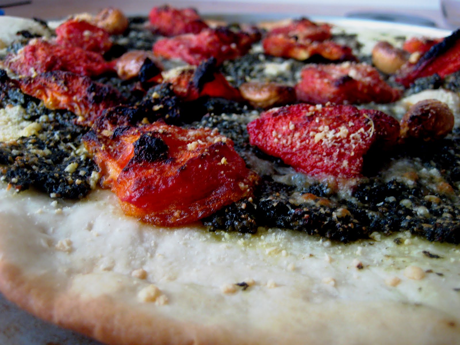 Irregardless of how much I chide my parents for their adoration of this delicacy. Pizza holds a pretty high place in my regard as well. (I’m pretty sure there’s a gene that controls this. And I have it. Probably multiple copies of it. In spades.) So when I was googling around trying to decide on what to make for the first Bittman-based IHCC. And stumbled upon this Plum Tomato Tart with Pesto. I knew I had to make it. As a pizza.