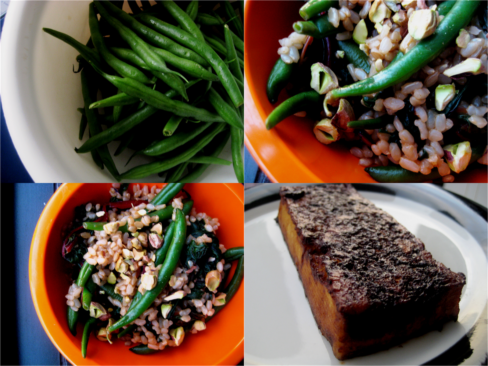 When deciding what to make I thought about what ingredients I had sitting in my fridge that needed to be used up. There was about a cup of coconut milk left over from a curry I had made. And some string beans and chard that I had bought at the farmer’s market last week. That I had absolutely no plans for. So I set to googling. And stumbled across this list of simple salad ideas that Bittman wrote for the NY Times last July. Number 96. Swapping in string beans for peas and red swiss chard for spinach. Rice and pistachios, which I always have on hand. And cardamom pods. Which I just restocked last month. Perfect.