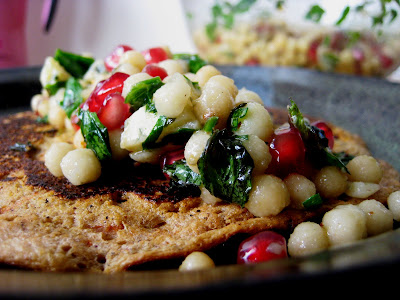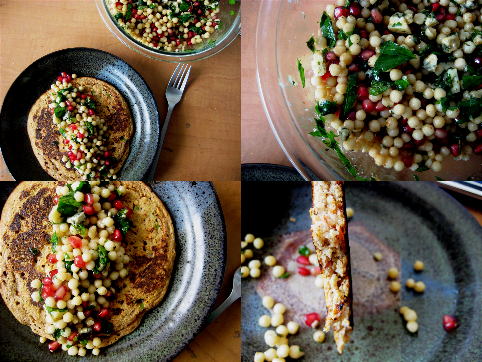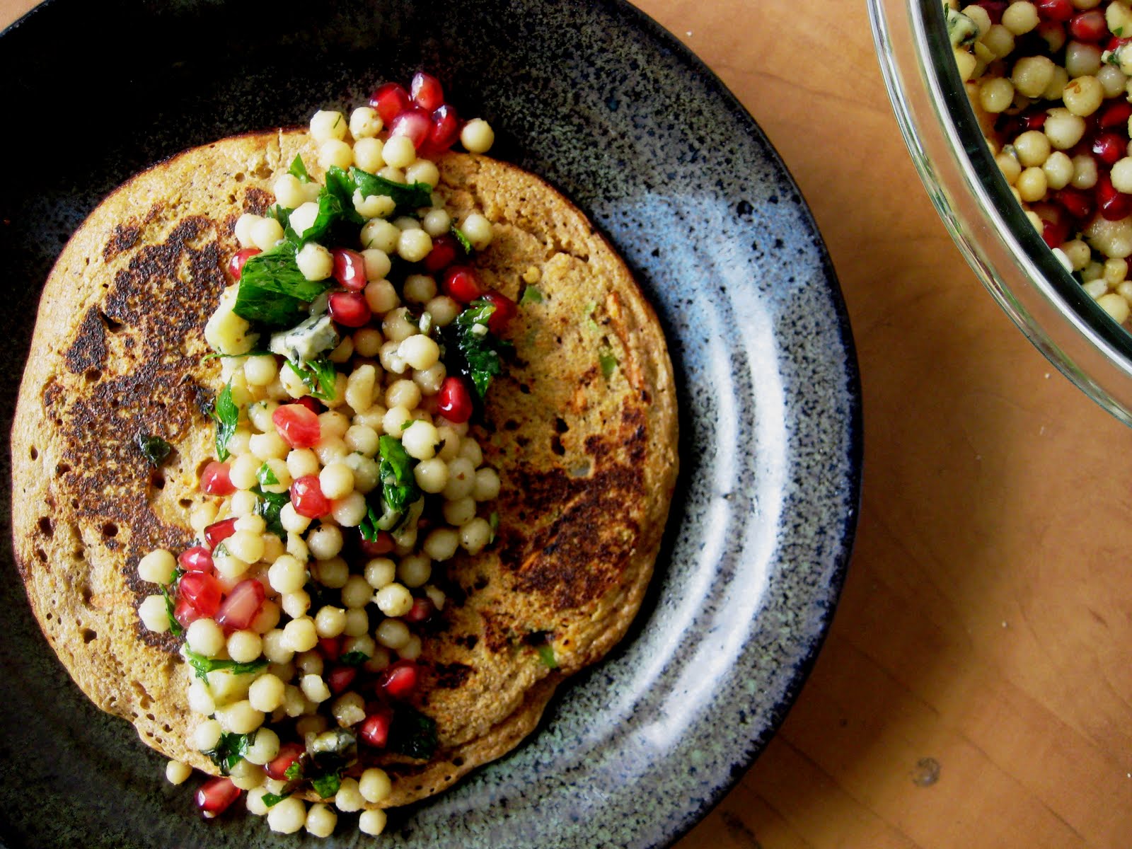 Yummy savory pancakes and the couscous looks so colorful with the pomegranates!