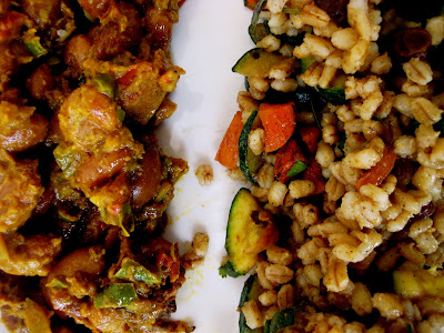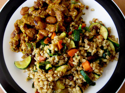 In the spirit of our little experiment (and so Sophie and I wouldn’t feel quite so left out) I knew that whipping up something with peanut butter was in order. When I came across this recipe for Nigerian Baked Beans on Lisa’s Kitchen, which called for not only peanut butter, but curry and a whole slew of other spices? I decided it was too serendipitous for me not to make it. And then to go with it? Spiced Carrot and Zucchini Barley from Bon Appetit’s Fast/Easy/Fresh (it was originally quinoa. But I ran out. Somehow.) The intense flavor and spiciness of the baked beans was balanced so nicely by the cinnamon-infused barley, which did really well to cool my palate after it was set on fire. (Or at least felt like it.) This is possibly one of the best meals that I have made so far this year. I am submitting the beans to this month’s My Legume Love Affair, which is being hosted by Ruchika of Ruchika Cooks. The spiced carrot and zucchini barley is going to this week’s Weekend Herb Blogging, hosted by Haalo of Cook (Almost) Anything.