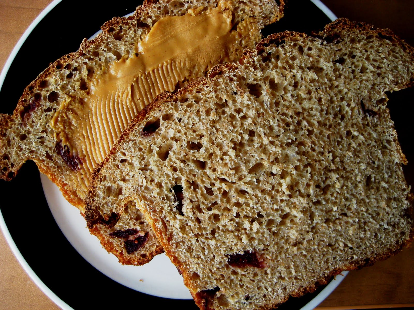 I ate this sandwich on the Milk and Honey bread from HBinFive. The substitutions I made to this were to use buttermilk in place of milk, agave in place of honey, and dried cranberries instead of raisins.