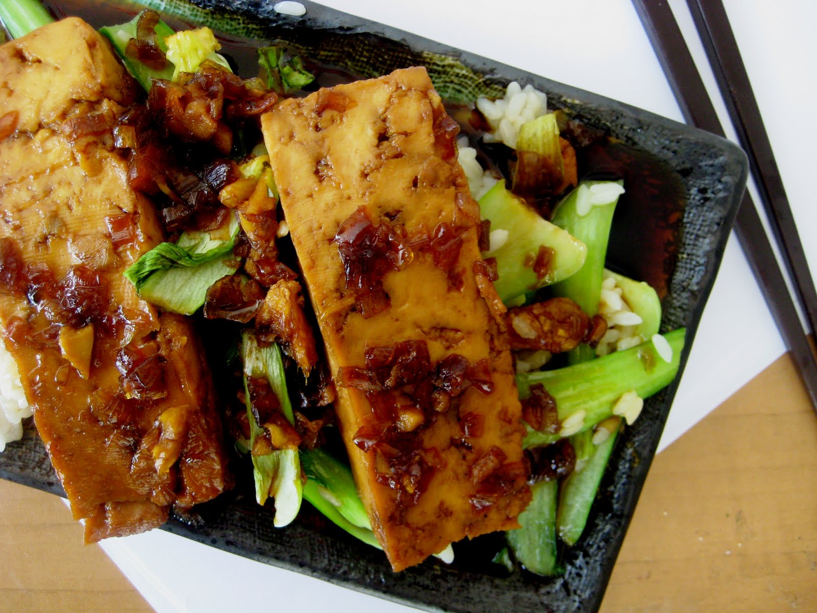 5. Place the tofu in the sauce in a single layer. Simmer uncovered for 7 minutes. Using a spatula turn the pieces over. Simmer for 3 or 4 minutes more. Plate the rice/bok choy mixture. Put the tofu over and pour the sauce over the whole mass of food. Top with freshly ground black pepper.