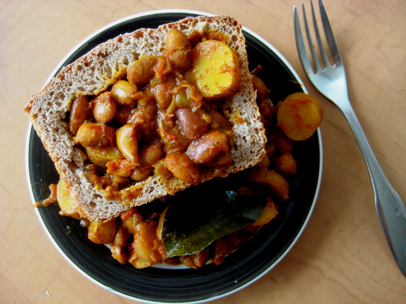 With reading the above article and comments mentioned thereafter, just a few points to bolster the whole bunny chow. I’m from Durban, the home of the bunny chow. It’s a very popular takeaway meal and, although traditionally they MAY have been served from carts, bunny chows are normally made on demand for the customer ensuring the meals are directly from the pot and less likely to spoil, from the various “curry dens” throughout the city. With the heat and humidity of Durban, prepared meals cannot stand for a prolonged period of time in the open. Also, with the drainage of the curried gravy into the bread, the aim is to have a solid quarter loaf of bread (better known as a bread bowl for the international audience) hollowed out and to allow the gravy to soak in, leaving the the exterior firm and easy to break off and eat, rather than to allow the whole loaf composition to degrade into a sloppy mess. The further one moves from Durban, the more varied and less curried the filling becomes, partially because the Indian influence with curries is less, but also because of the varied traditional cuisine from various ethnic groups. But, like anything what is a nice meal, just be conscious what you put into it that counts. Variants range from french fries crammed into a quarter loaf all the way to the more traditional curry fillings described as before. My personal favourite is a “beans bunny”, as it’s locally called (and no, the name has no bearing to cute little bunnies whatsoever, but rather to a meal-in-a-bun) Thanks for a great article, it was a pleasure to read.