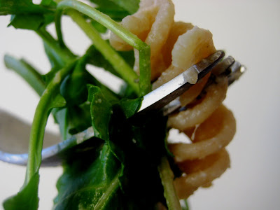 4. Add the pasta to the boiling water and cook until al dente. Drain the pasta from the water and add it to the sauce. Toss the pasta to combine it with the sauce. In a bowl, spread a layer of arugula, a layer of pasta and top with some fiddleheads. Enjoy.